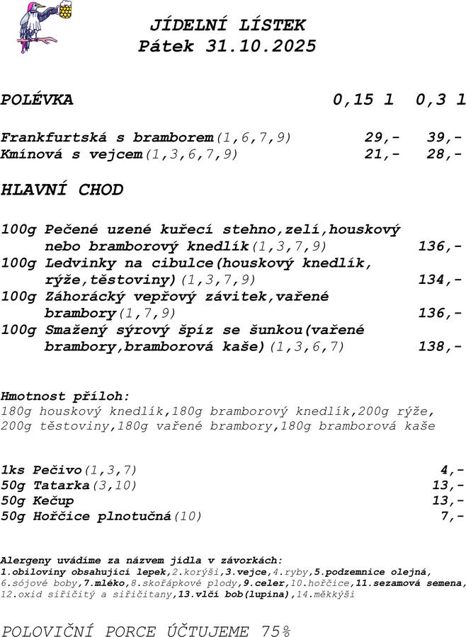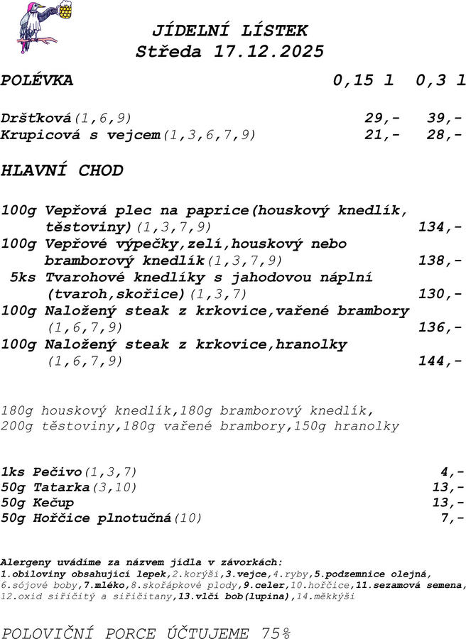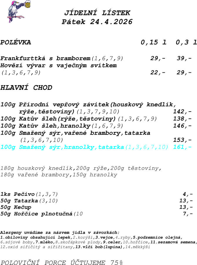 modře psané jídlo je za cenu do výdejního okénka + 10,-Kč, červeně psané jídlo je za za stejnou jako na jídelním lístku